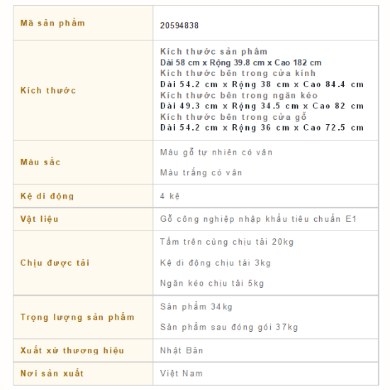 | K.thước sản phẩm | Dài 58 x Rộng 39.8 x Cao 182 cm |